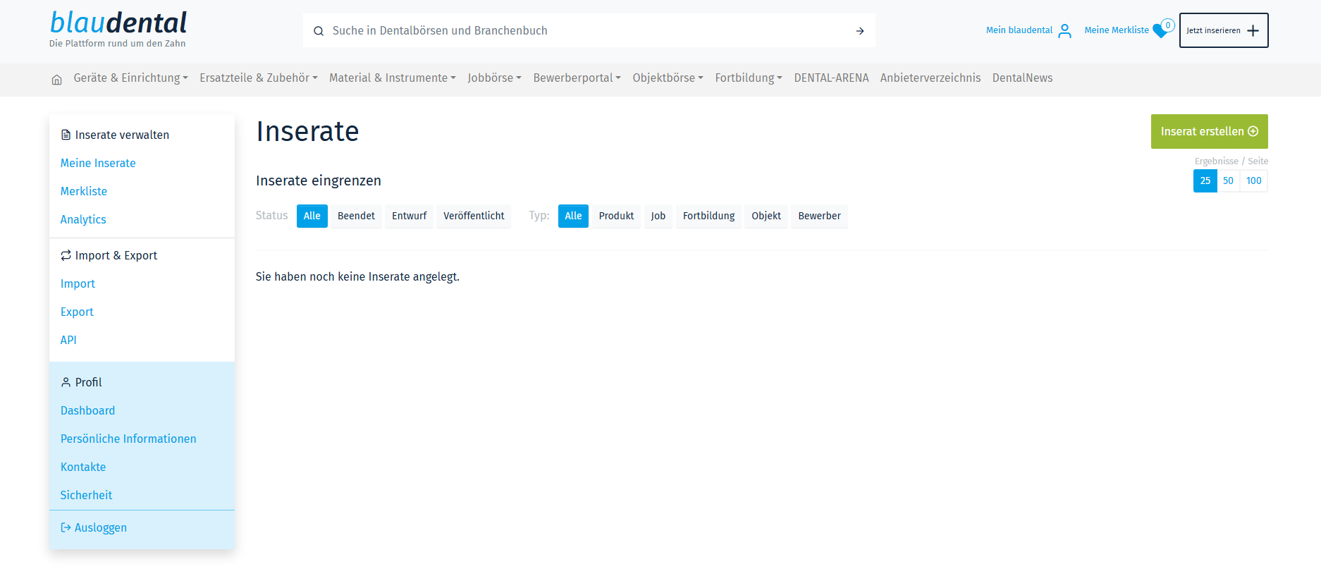 Inserate: Hier finden Sie Ihre Inserate / Angebote. Sie können diese nach Anzeigenstatus (Beendet / Entwurf / Veröffentlicht) und Anzeigentyp (Geräte / Jobs / Objekte / Fortbildungen) filtern.